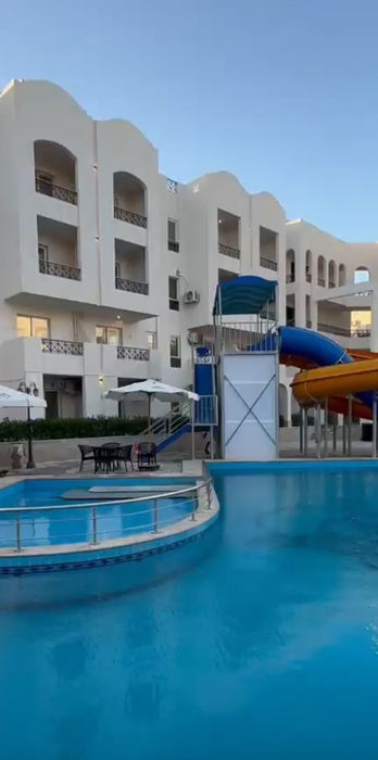 شقة بقرية سانتوريني الساحل الشمالي متقسمه ٢ غرفه و حمام و مطبخ و رسيبشن